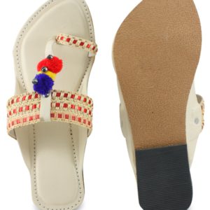Estonished Beige & Red Flats With Pom Pom
